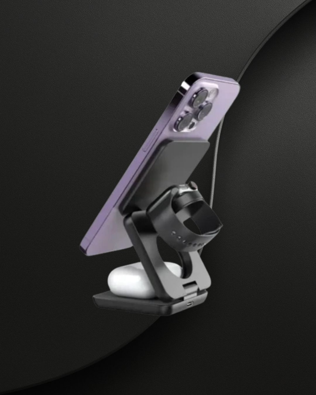 Avec PadVoltuaAxis, simplifiez votre espace : rechargez votre iPhone, Apple Watch et AirPods simultanément grâce à un support stable et compact. L’efficacité, sans compromis.